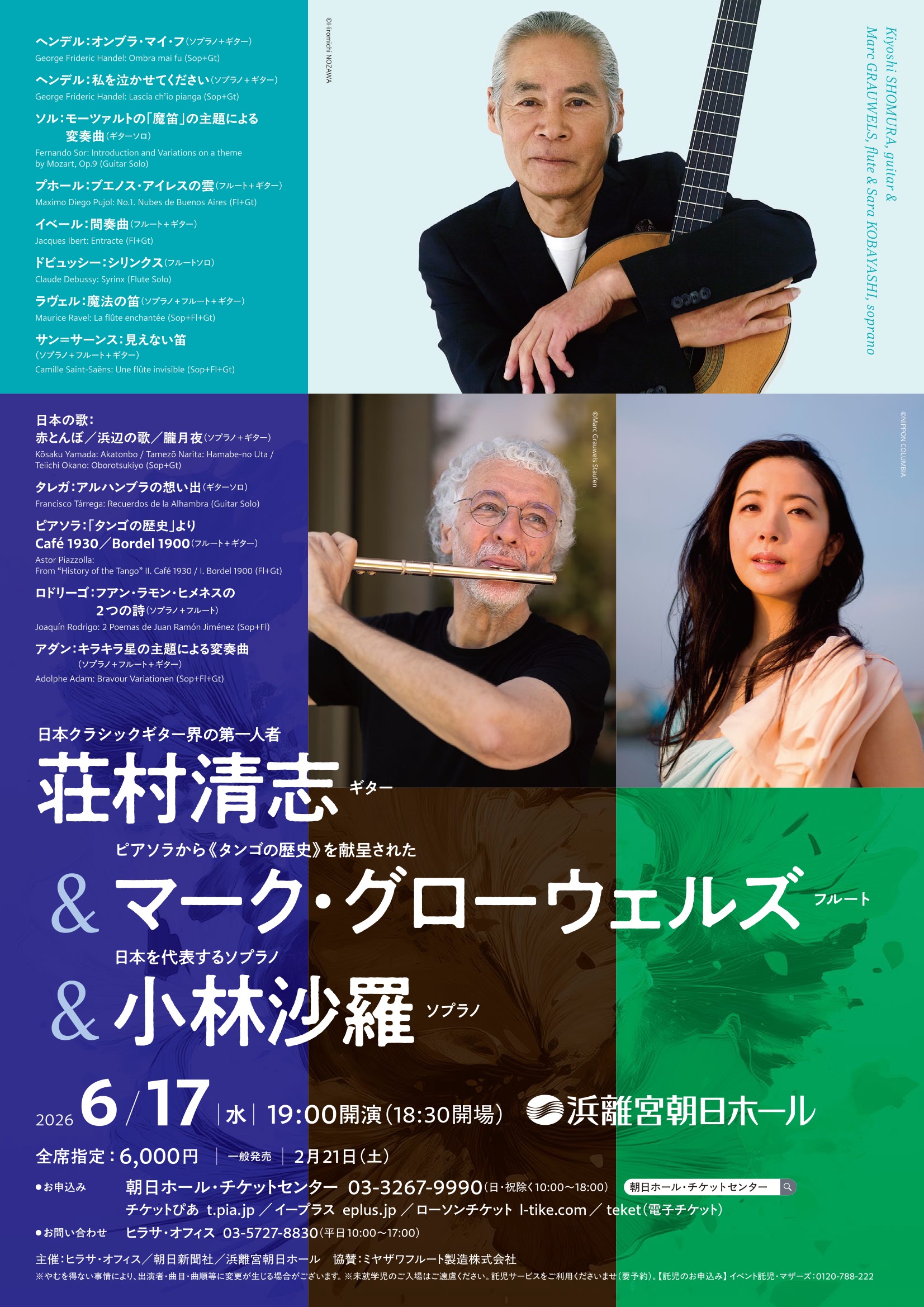 荘村清志(ギター)、マーク・グローウェルズ(フルート)、小林沙羅(ソプラノ)